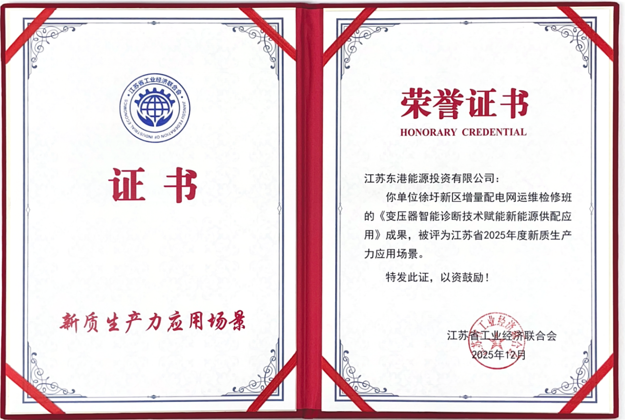 近日,东港能源公司《变压器智能诊断技术赋能新能源供配应用》成果成功入选江苏省2025年度新质生产力应用场景,为区域新型电力系统建设提供了可复制的智能化运维样板。