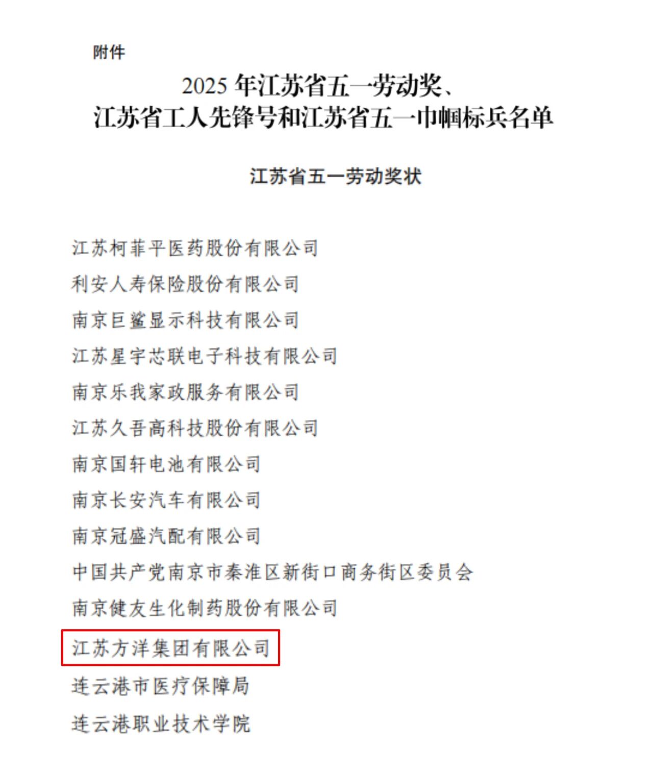 12月19日,江苏省总工会、江苏省人力资源和社会保障厅联合发布《关于表彰2025年江苏省五一劳动奖、江苏省工人先锋号和江苏省五一巾帼标兵的决定》。江苏方洋集团凭借在绿色能源保障、园区产业配套服务及赋能产业升级等方面的卓越表现,荣获“江苏省五一劳动奖状”。这一殊荣的获得,不仅是对集团全体员工实干拼搏、锐意进取精神的高度认可,也是对集团未来发展寄予的新期望。